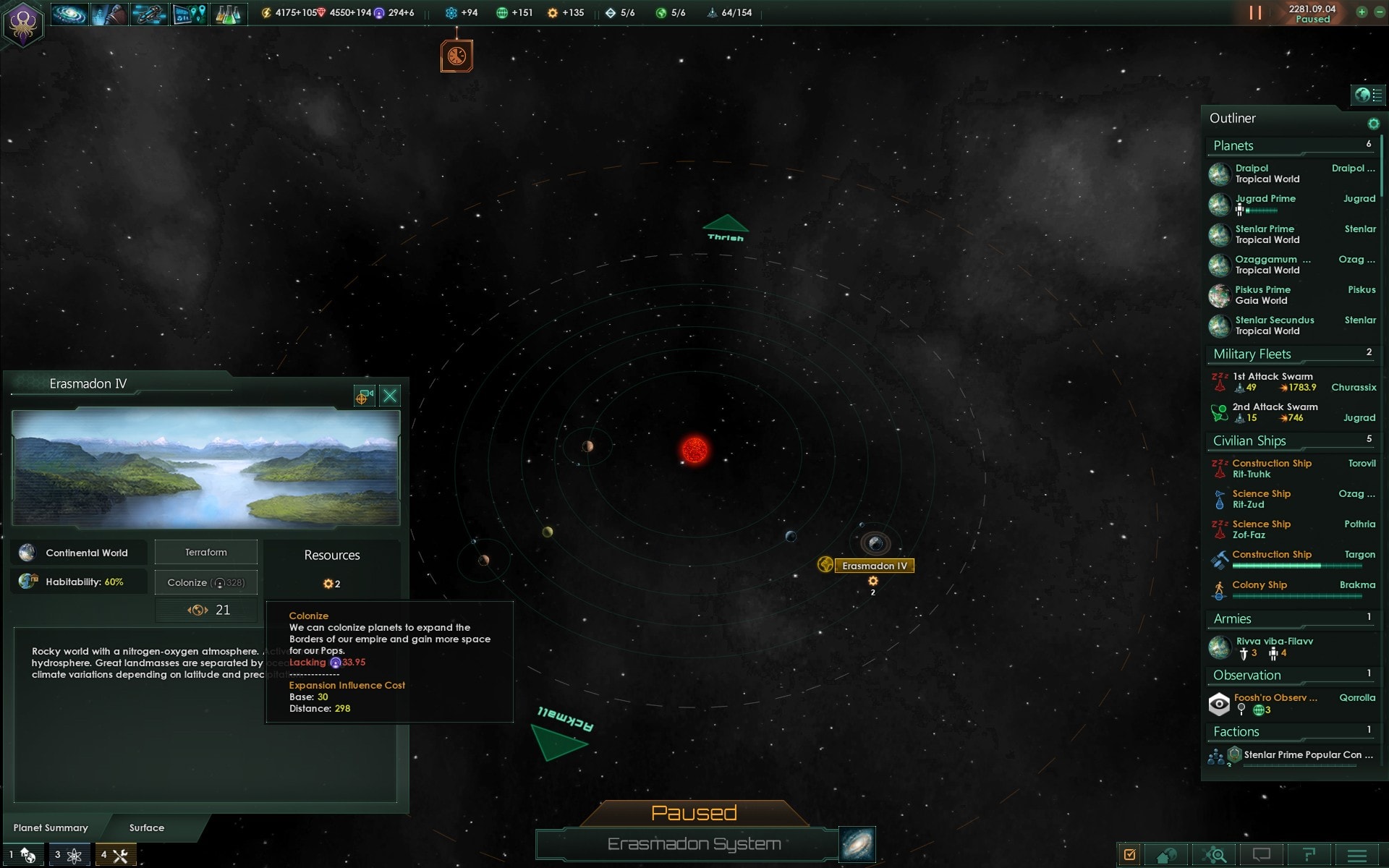 Afin d'atténuer les abus liés aux frontières ouvertes, nous avons choisi d'ajouter un coût en influence à la colonisation des planètes ou à la construction des Avant-Postes Frontaliers. Ce coût sera basé sur la distance par rapport au système possédé le plus proche.