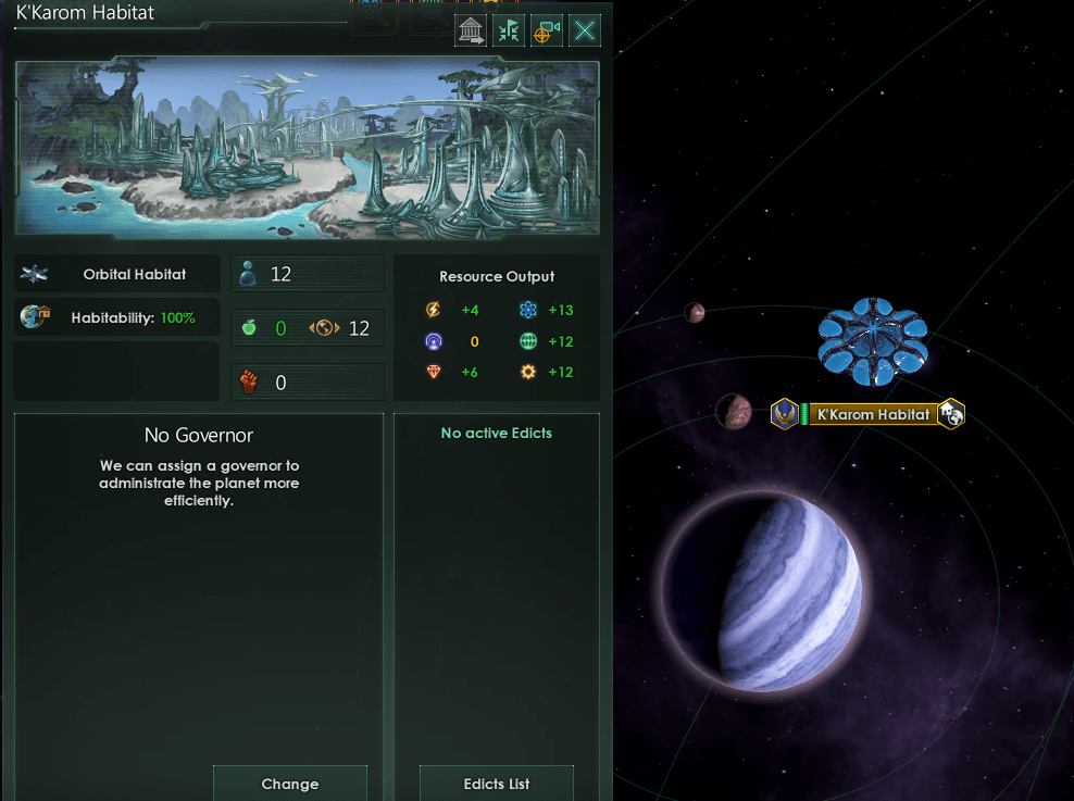 Les habitats orbitaux sont l'une de nos solutions à ce problème : Au lieu de vous étendre vers de nouveaux systèmes et de coloniser de nouvelles planètes, vous créez de nouvelles "planètes" artificielles vous que vos Pops puissent y vivre. Les Habitats orbitaux sont de massives stations spatiales qui fonctionnent comme de petites (actuellement de taille 12, mais il se pourrait qu'il ne s'agisse pas de la valeur définitive) planètes qui (comme les mondes Gaïa ou les Anneaux-Mondes) ont 100% d'habitabilité pour toutes les espèces. Ils peuvent être construits autour de n'importe quelle planète (donc ni astéroïde, ni satellite) non-habitable de votre espace, et il n'y a pas de limite au nombre d'habitats que vous pouvez construire, si ce n'est le nombre de planètes qui peuvent les accueillir. Les Habitats fonctionnent exactement comme une planète : ils peuvent être colonisés par n’importe quelle Pop qui souhaite y vivre, ils peuvent être exploités en y construisant des bâtiments, et ils comptent comme une planète pour ce qui est des coûts de recherche à l'échelle de l'empire. Afin de construire un habitat, vous devez avoir recherché à son niveau maximal la technologie des spatioports, et avoir choisi le bonus d'Ascension "