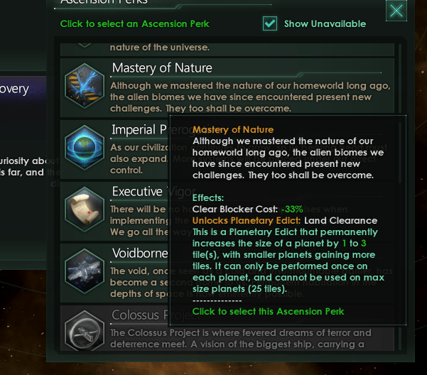 - Maîtrise de la nature : L’ascension maîtrise de la nature est devenue une ascension assez bancale. À l’origine elle était prévue comme un moyen de nettoyer tout les bloqueurs de cases sur les planètes mais c’était de façon évidente trop faible. Nous l’avons donc renforcée pour qu’elle débloque aussi toutes les technologies de bloqueurs. Mais cela est alors devenu trop fort et nous l’avons à nouveau changée en faisant en sorte que cette ascension diminue de 50% le coût de suppression des bloqueurs. La maîtrise de la nature est devenu alors intéressante seulement si prise en 1er. Au final nous sommes revenus à la planche à dessin et nous l’avons refait pour qu’elle devienne plus utile à tous les stades de la partie tout en donnant une utilité supplémentaire à l’influence pour les empires qui ne vont pas s’étendre beaucoup sur la carte. Cette nouvelle version au lieu de donner les technologies de bloqueurs vous donne plutôt la possibilité d’un nouvel édit qui peut augmenter de façon permanente la taille de vos planètes. Suite à cet édit, la taille des planètes pourra augmenter de 1 à 3 cases en fonction de sa taille initiale (la récompense étant plus forte pour une petite planète que pour une grosse et une planète de taille 10 passera toujours en taille 13). Ces nouvelles cases auront aussi des ressources de bases ajoutées de façon aléatoire.