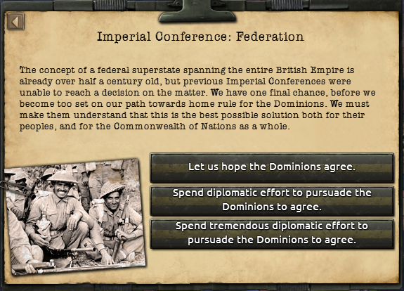 L’Inde est un cas particulier. Ils ne sont pas un Dominion, si vous voulez leur soutien vous devrez d’abord faire en sorte qu’ils le deviennent. C’est là qu’entre en jeu le focus « Autonomie indienne ». Cela fera du Raj un Dominion, tout en leur donnant +0.5 de gain d’autonomie pour deux ans. Si vous faites cela avant de lancer la Fédération impériale, le Raj pourrait (avec la même mécanique de restriction d’opinions) accepter la proposition de fédération. En revanche, si vous ne le faites pas avant de lancer la conférence, ils le refuseront toujours.