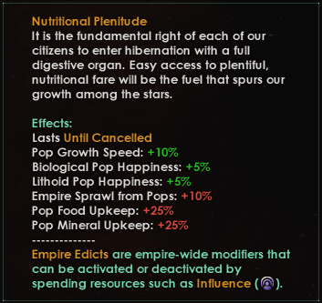 Les lois sur la croissance de la population était un problème ainsi nous avons réalisé quelques changements qui réduisent cette croissance à tous les niveaux du jeu (plus d’informations sur ce sujet dans un autre carnet). Les lois sur la consommation de nourriture ne sont plus et la plénitude nutritionnelle est maintenant un Édit.