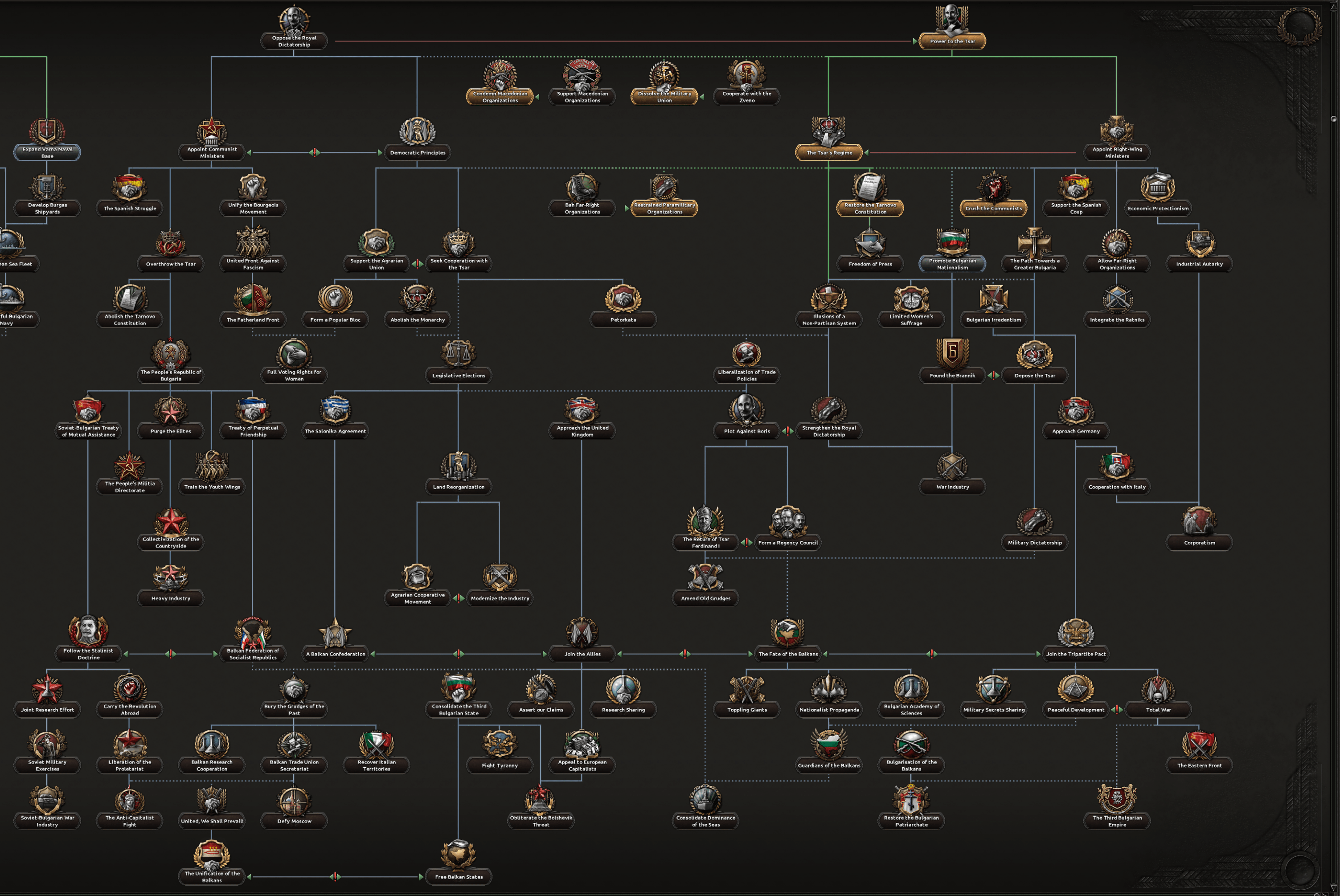 Le focus « Renverser le tsar » (tout comme ses homologues des autres branches) peut être pris assez tôt, mais soyez averti, si votre stabilité n'est pas assez élevée lorsque vous terminez ce focus, vous pourriez vous retrouver au milieu d'une guerre civile, ce qui pourrait ne pas être la situation idéale pour la Bulgarie une fois que les grandes puissances commenceront à faire leurs mouvements dans les Balkans...