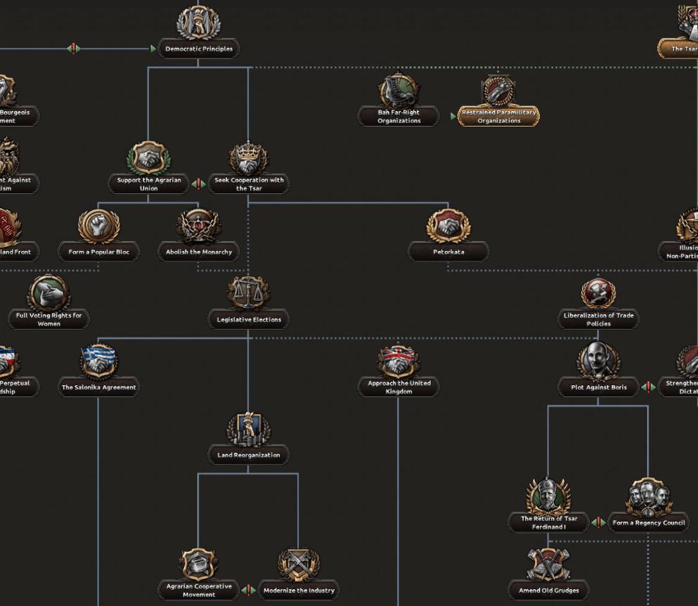 Après de multiples pérégrinations, nous voilà enfin arrivé en face de l’arbre politique ! Commençons par les focus les plus importants, ce qui me permettra de vous présenter le système interne des factions bulgares :