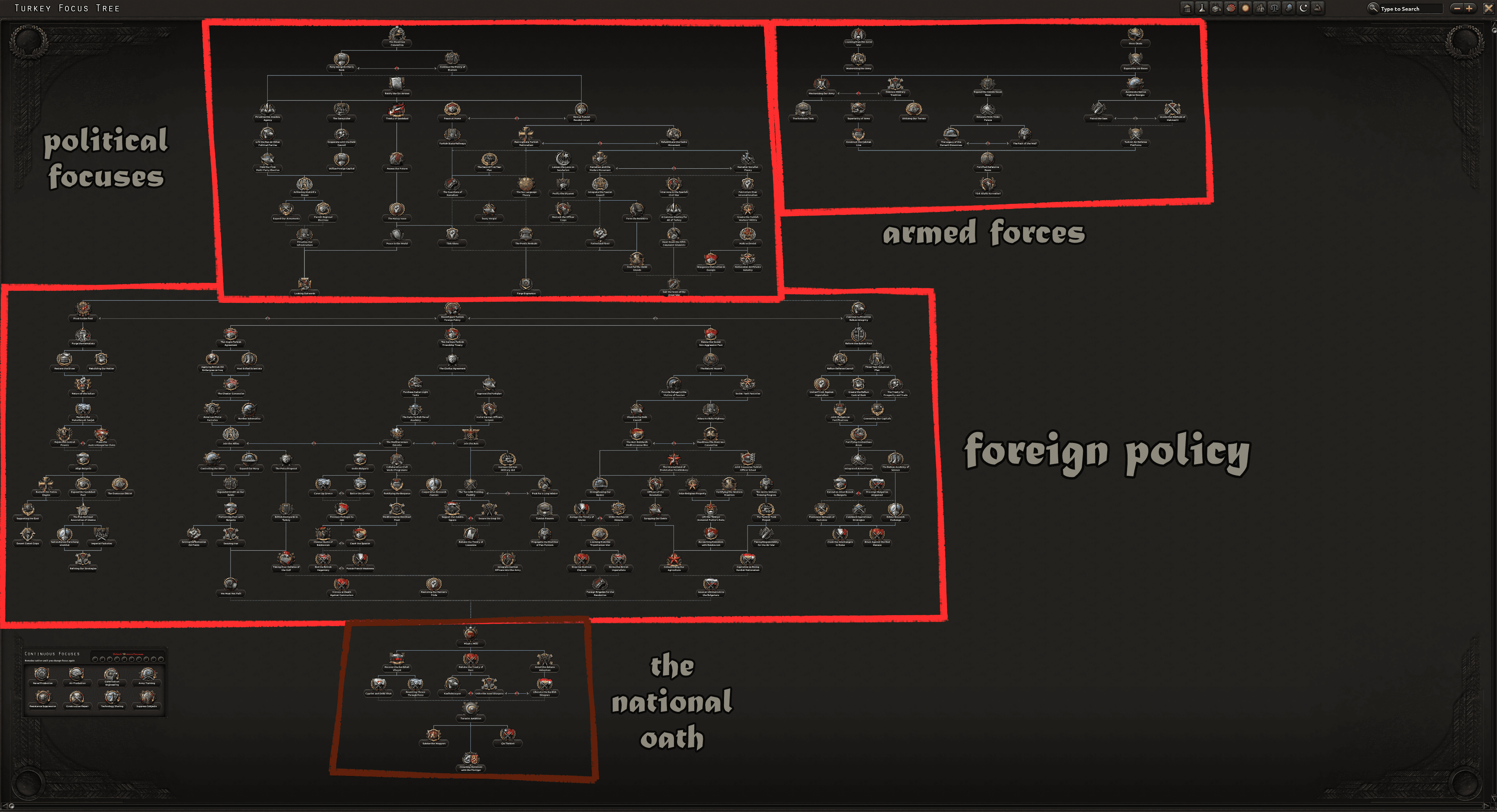 L'arbre est fractionné d'une manière qui devrait plutôt donner l'impression d'être interconnecté, et cela en raison de la situation politique unique de la Turquie. Tous les chemins de l'arbre politique, sauf un, ne consistent pas à faire surgir un parti fasciste de nulle part ou une révolution communiste magique, mais à redéfinir l'idéologie du kémalisme et sa signification pour l'État. A gauche, vous pouvez voir les voies libérales et démocratiques - liées au petit arbre de l'industrie turque qui, pour la plupart, est en fait intégré dans l'onglet des décisions. Au centre se trouvent les axes d'action historiques de la Turquie, et oui - Hatay est une province qui a été ajouté au jeu ! A droite, vous avez les formes de gouvernement autoritaires, dans lesquelles vous trouverez le chemin historique qui part du focus « La Paix à la maison ».