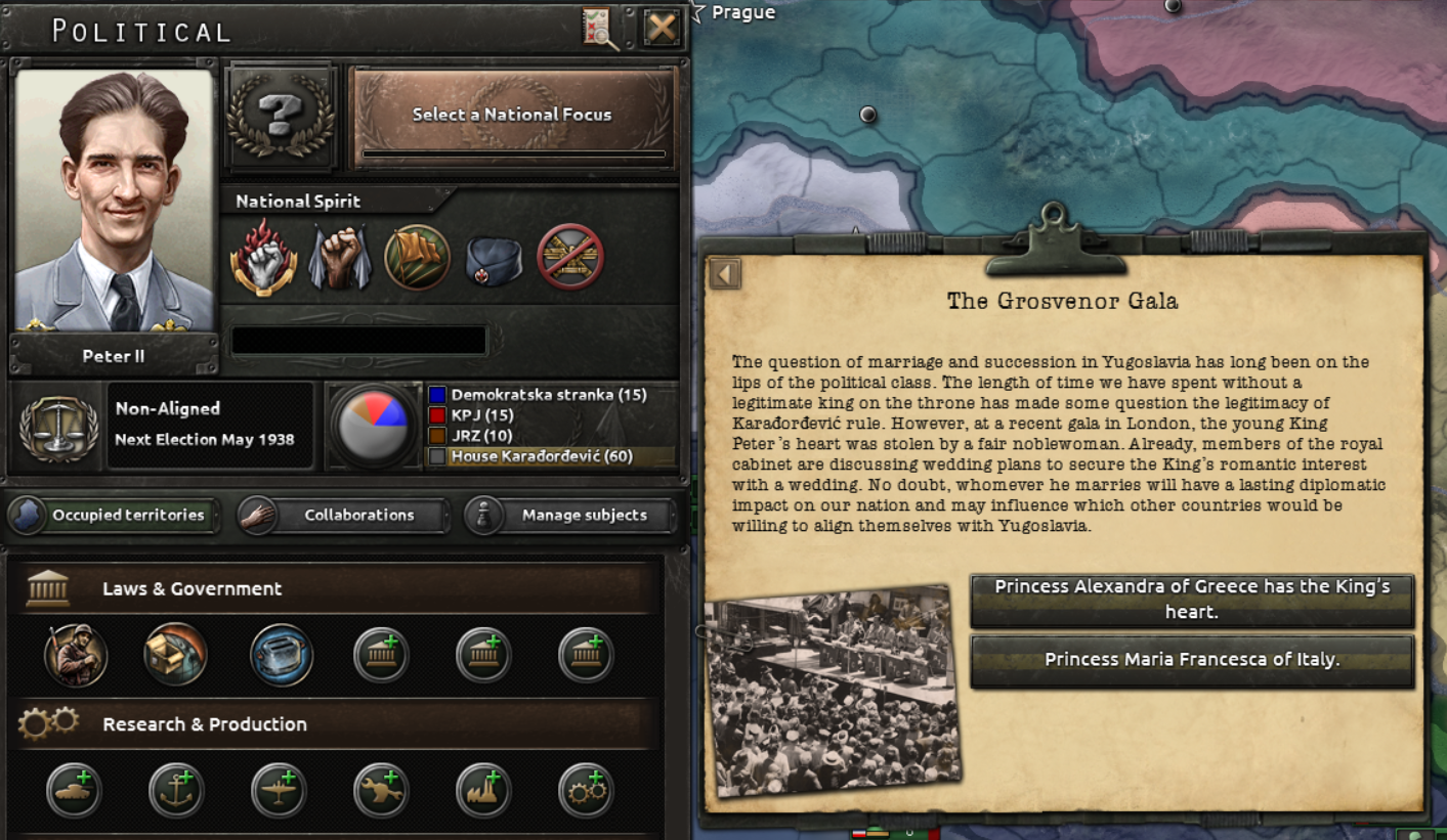 L'adhésion aux Alliés comporte son lot de difficultés, outre la distance de vos amis à l'Ouest. Le roi Pierre n'a que 12 ans en 1936 et si vous tentez de mettre fin à la régence trop tôt, vous vous retrouverez avec un monarque qui n'est malheureusement pas préparé à gouverner.