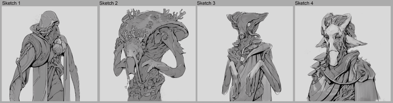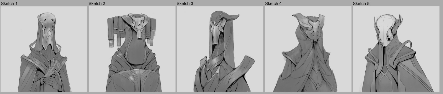 Après cette phase de croquis, on reprend le même processus que pour faire des vaisseaux. Des différents croquis, le meilleur est sélectionné, son concept poussé plus loin avec de nouvelles variantes et poses. Une fois heureux du résultat, on teste alors la coloration et les ombres.