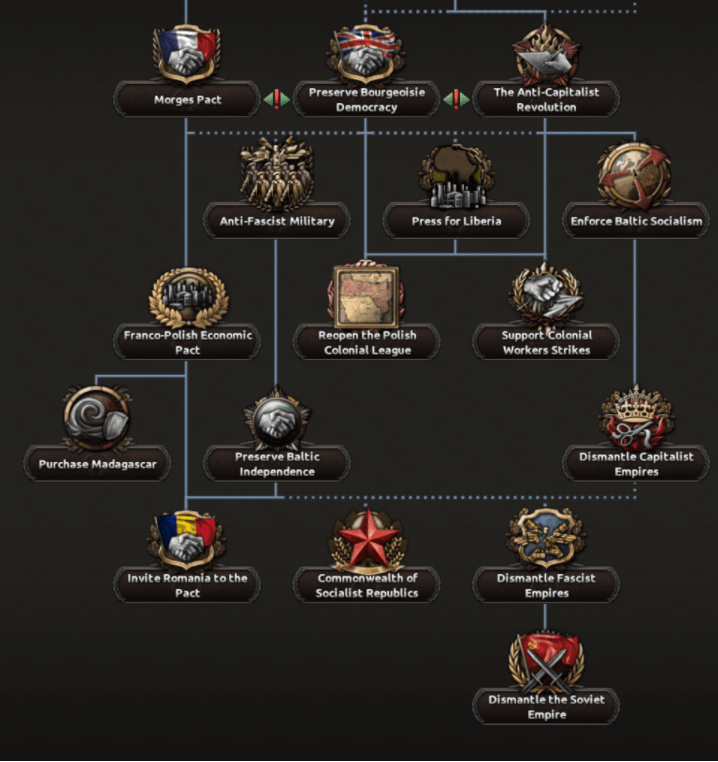 Les démocrates et communistes anti-soviétiques pourront aussi déclarer la destruction du fascisme comme une plus grande cause que la propagation du socialisme et s’aligner sur l’Empire Britannique. Cette option permettra à la Pologne de renouer avec les intérêts du colonialisme et de tenter d’acheter des colonies aux Alliés. En reconnaissant officiellement la Ligue Maritime et Coloniale, la Pologne pourra acheter Madagascar, la Palestine, et d’autres territoires, ce qui lui permettra de bâtir une force en exil dans le cas où le pays aurait été conquis.