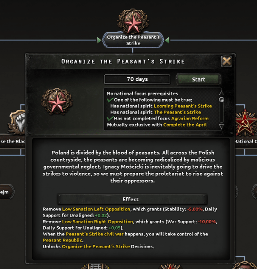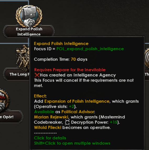 Avec Pavel, Piasecki ou Dmowski aux commandes, la Pologne se verra présenter une échelle de focus leur permettant soir d’obtenir de puissants bonus de la part des Allemands soit de comploter avec l’Etat Clandestin pour renverser ces maîtres actuels.