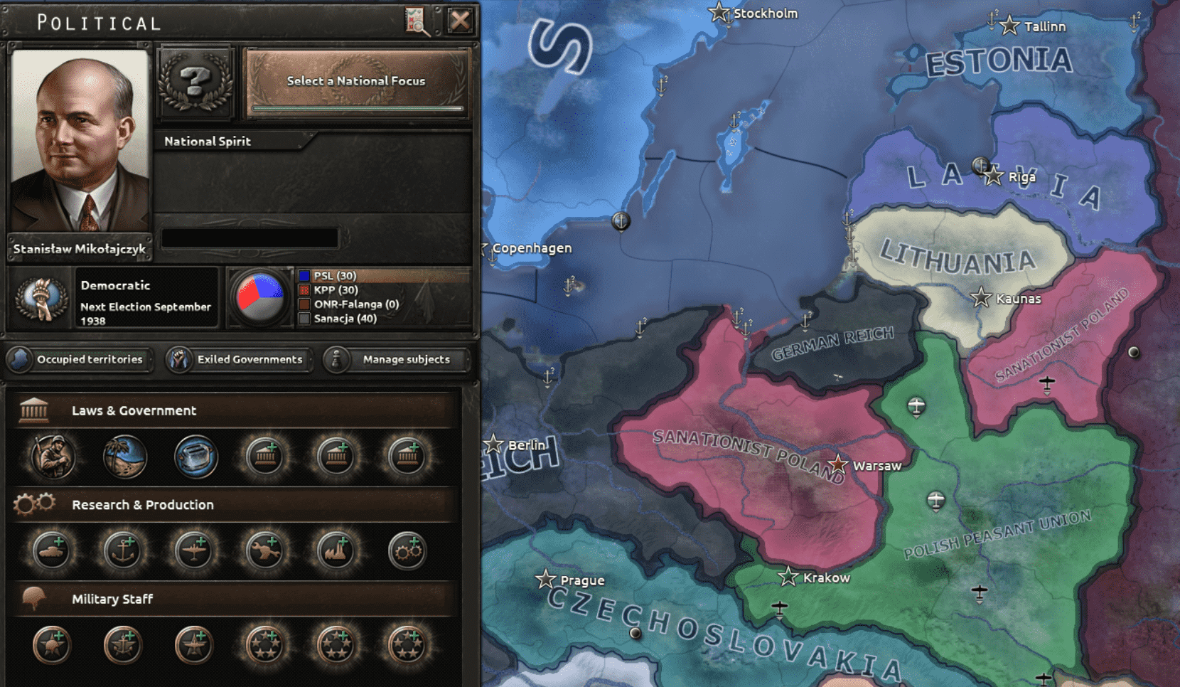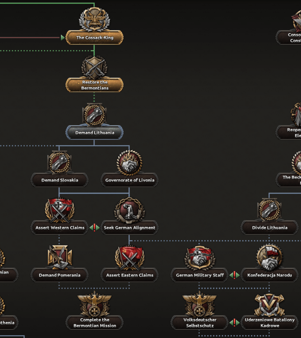 Une fois les états baltes conquis, Pavel pourra diriger son royaume de Pologne vers l’Allemagne pour revendiquer ses territoires de Silésie et de Poméranie, ou en tant que national-socialiste, s’aligner sur l’Axe avec son arbre de focus dédié au fascisme.
