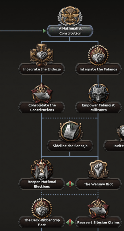 La Pologne était le foyer d’une multitude de mouvements fascistes et nationalistes : le plus notable d’entre eux était Endecja (ou Démocratie Nationale) et Falanga. Le Gouvernement historique traita avec ces deux groupes, et si vous souhaitez que l’un deux prenne le pouvoir, vous devrez collaborer avec le gouvernement pour ensuite le supplanter.