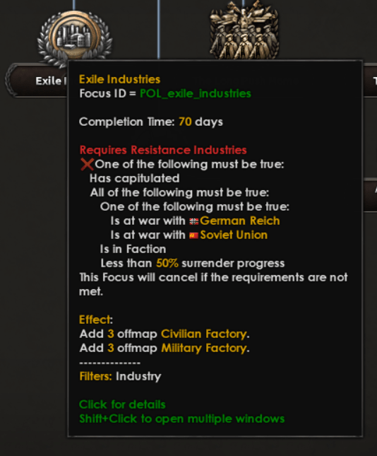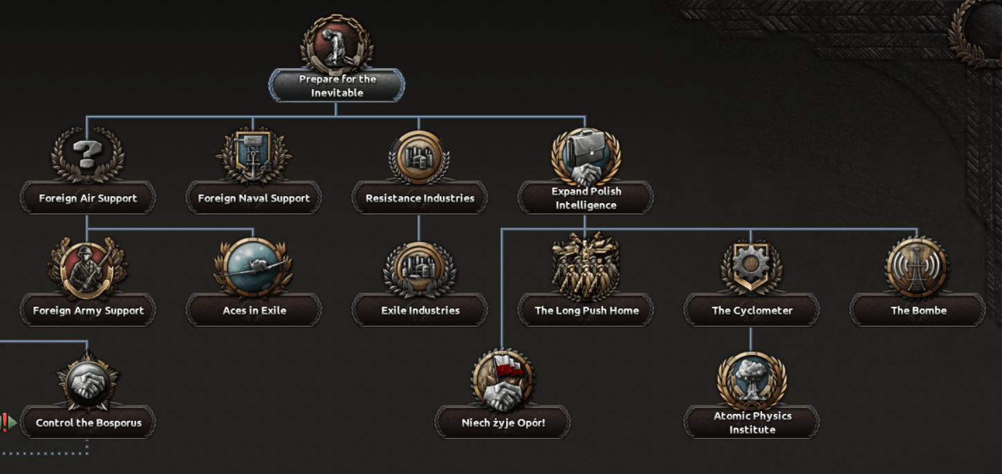 Dans la branche de l’arbre dédié à l’exil, la Pologne peut gagner un certain nombre de chantiers navals et d’usines hors carte, et un bonus dans la génération d’as en plus d’une augmentation de la limite de forces spéciales. Le gouvernement polonais ne pourra jamais constituer une grande armée en étant en exil, mais avec de tels bonus, elle pourra poursuivre le combat avec une petite force spécialisée.