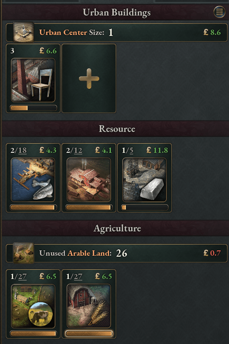 . Comme les bâtiments de subsistance, ils sont créés automatiquement au lieu d’être construit. Le niveau du centre urbain dans un état est lié à la progression de l’urbanisation générée par d’autres bâtiments. Les centres urbains emploient principalement des commerçants et fourniront un certain nombre de fonctions locales importantes sur lesquelles nous nous étendrons plus tard.