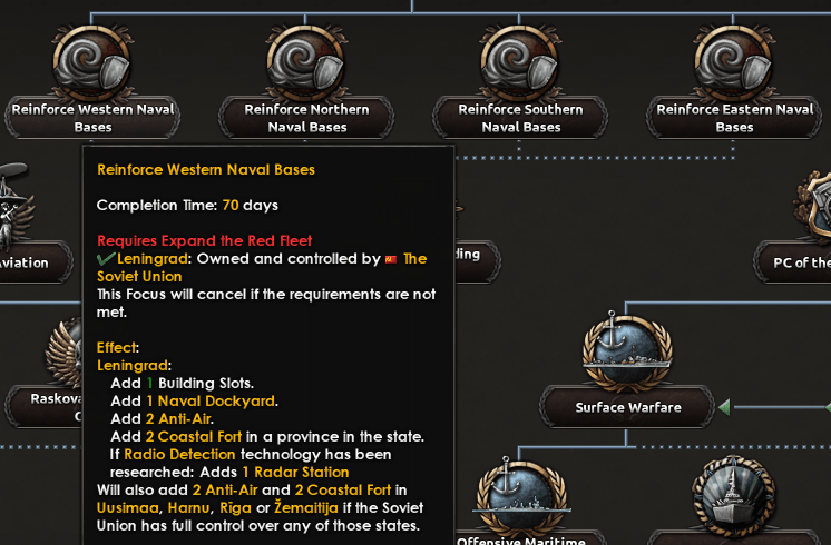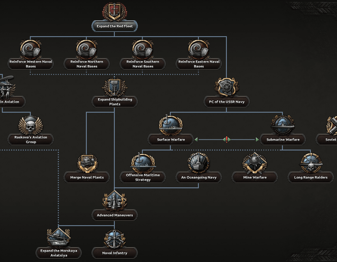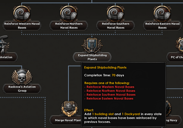 Cet esprit national sera par la suite amélioré dans les focus ci-dessous, selon vos choix entre la guerre en surface ou sous-marine. La plupart fourniront de l’expérience navale, bonus de recherche et réduction de coût de production pour les navires correspondants.