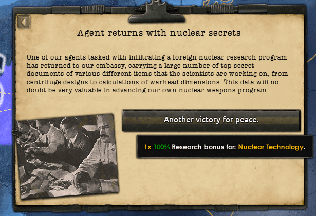 Le focus nécessite d’avoir construit au moins 7 académies des sciences, et fournira un ensemble de bonus et d’outils pour infiltrer les programmes atomiques ennemis et créer votre propre bombe nucléaire, tels qu’un nouvel emplacement d’espion et un espion historique.