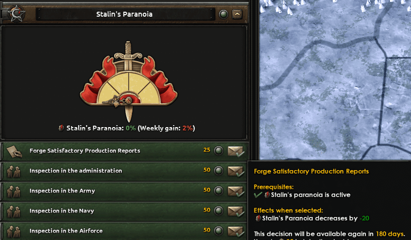 Ces focus liés à la Purge auront des délais à observer avant d’être lancés ce qui empêchera le joueur de se précipiter sur cette partie de l’arbre. Mais Mais une fois que vous aurez complété “Le Bloc des Droits et Trotskystes”, l’événement du 3ème Procès de Moscou va se produire et le système de Paranoïa sera retiré du jeu: les Purges prennent finalement fin.