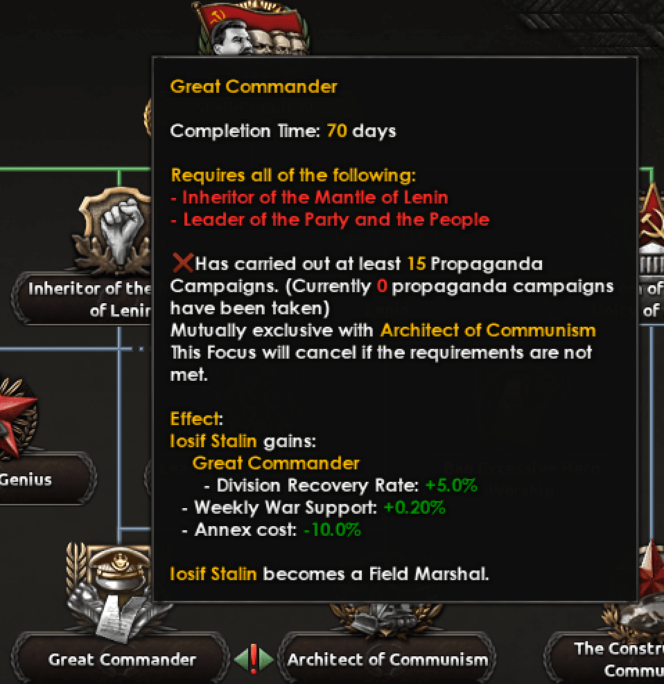 Retour sur le culte de la personnalité, tous ces focus sont des titres qui ont été donné à un moment donné à Staline dans la vie réelle, et ils donneront à Staline de nouveau traits ou renforceront ceux existant. Afin de souligner le caractère de propagande et de manipulation de masses de ces focus, ils demanderont tous qu'un certain nombre de campagnes de propagande aient été activées, et plus on descendra dans la branche, plus il en faudra.