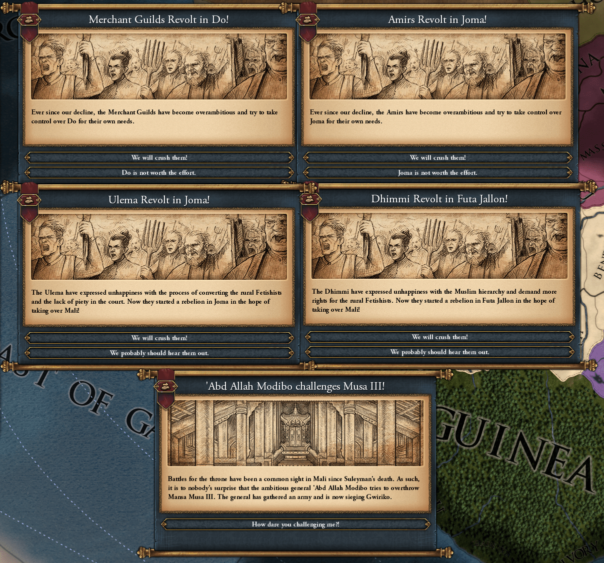 Dans le même temps, les missions du centre vous pousseront à la reconquête d'anciens territoires, offrant des revendications permanentes sur Macina, Djenné, Tombouctou et le Songhaï. Un bonus supplémentaire vous gratifiera d'un point de stabilité à chaque conquête territoriale effectuée tant que le désastre restera actif. De plus, alors que vous poursuivrez vos conquêtes selon vos désirs, vous déclencherez ces événements via l'arbre des missions: