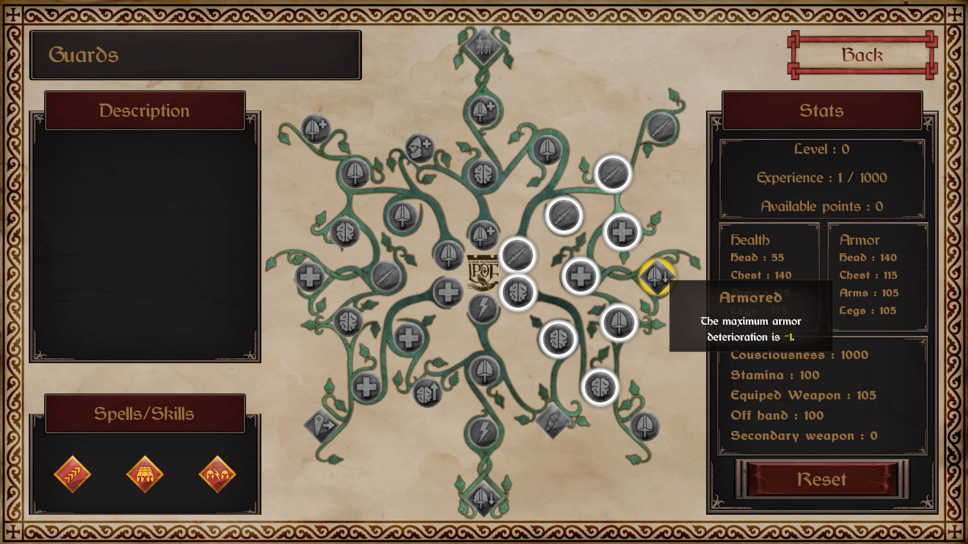 Mais on va plutôt parler ici de ce qu'offre l'alpha disponible sur Steam. Quand on lance le jeu pour la première fois on est invité à passer par la caserne, là on pourra faire deux choses, gérer notre personnage ou gérer nos unités. Bien entendu il faut commencer par gérer notre personnage, on peut éditer notre visage donc évidemment on va commencer par ça et ensuite on va s'attaquer à l'équipement en mettant un casque qui masquera complètement ou presque notre bonne bouille car il faut bien se protéger, un mauvais coup est si vite arrivé. Pour l'armement on choisit notre épée, peut être une lance on ne sait jamais, on prendra une armure plus ou moins lourde et un solide bouclier car les javelots volent bas. Après quelques combats où l'on aura taillé quelques adversaires en pièces on pourra mettre des points de compétences dans son arbre de talents pour avoir des passifs nous rendant plus fort ou pour apprendre à donner des sales coups, mais c'est leur faute en face, ils n'avaient qu'à pas exposer leur visage aussi, ça leur apprendra.