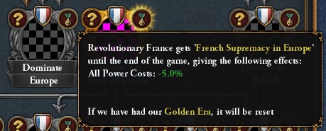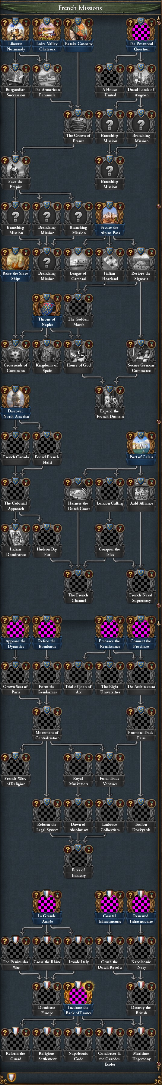 On note que comme pour les autres arbres de « nouvelle génération », il a été divisé en trois grandes parties. La première concerne la diplomatie et la conquête de nouveaux territoires, la seconde les affaires internes (économie, gouvernement, armée, religion, etc), la dernière se focalisant presque exclusivement sur la Révolution.