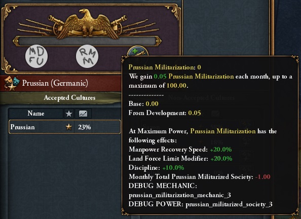 La Militarisation Prussienne a été repensée. Elle disposera à présent de 3 stades différents, dont les deux derniers seront débloqués par les missions militaires du pays (