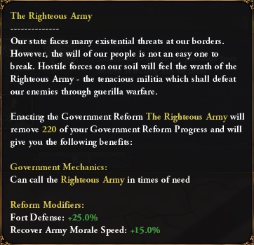 Enfin, le pays se dote d'une autre réforme gouvernementale unique, l'Armée des Justes :