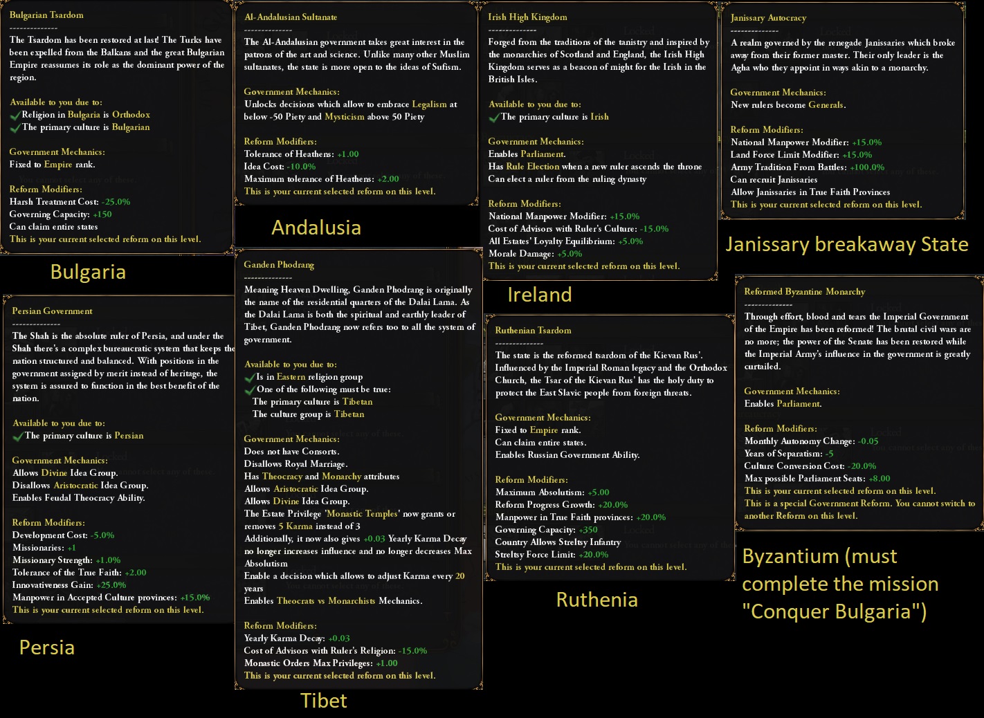 Le pays débutera lui aussi avec une réforme gouvernementale unique de niveau 1, Royaume Ermite, laquelle est associée à une nouvelle mécanique, le Perfectionnisme :