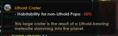 Comme indiqué précédemment dans DD#305, nous avons repris Calamitous Birth pour lui donner un peu d’amour. Cela comprend la suppression de la perte d’habitabilité des cratères lithoïdes pour les pops lithoïdes ainsi que l’augmentation de l’efficacité des traits exclusifs lithoïdes tels que les sous-produits gazeux sur le monde des cratères massifs.