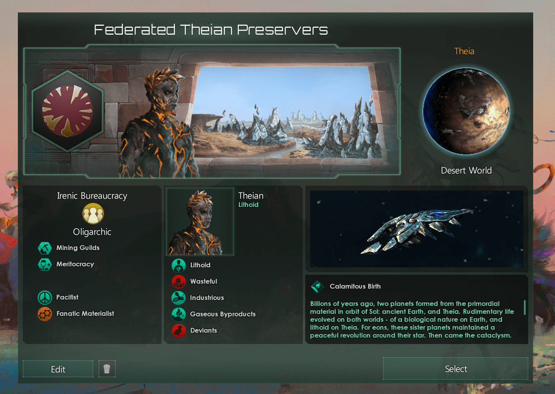 Pour les lithoïdes, les réserves fédérées de Théian seront un nouvel empire prescrit qui commence sur le monde désertique de Théia, dans le système Titawin.