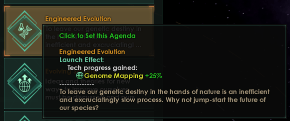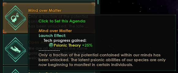 Chaque chemin d’ascension a maintenant un agenda qui accorde 25% de progrès dans les technologies associées à ce chemin d’ascension, ce qui devrait garantir que vous ne dépendez plus du hasard pour acquérir ces technologies. Ces agendas ont un coût et un refroidissement réduits par rapport aux agendas normaux, bien que certains aient des modificateurs basés sur la compatibilité de l’éthique de l’Empire avec le chemin de l’ascension.