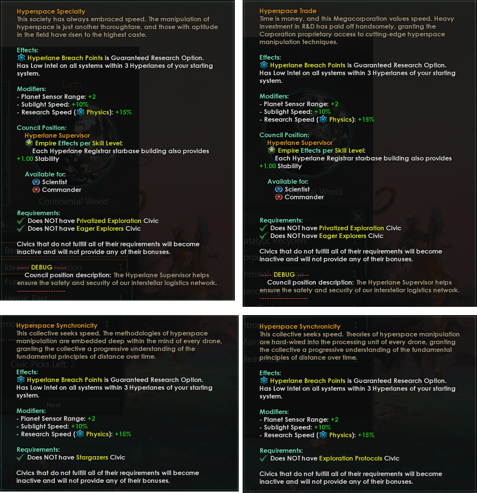 Vous devez aller vite ? C’est peut-être pour vous. Ce civisme vous mettra sur la voie rapide pour la recherche sur les hyperlignes, vous offrira une vitesse supplémentaire en dessous de la lumière et stimulera vos recherches en physique. La recherche en physique est un autre thème récurrent dans les plans astraux - l’observation de nombreux phénomènes à l’intérieur des failles donnera de nouvelles perspectives à vos scientifiques.