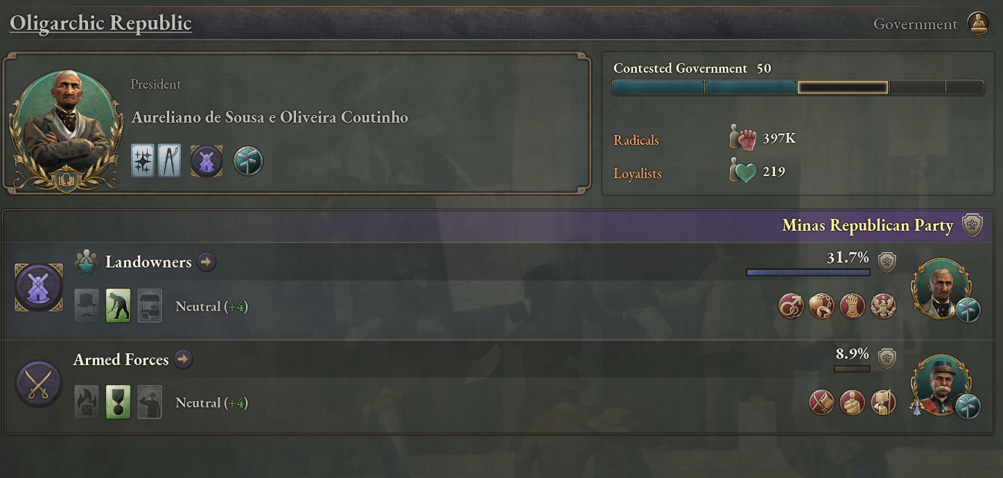 pour les groupes d'intérêts, reflétant les caractéristiques historiques uniques des groupes du monde entier. Ces traits fournissent des bonus ou des malus spécifiques aux nations en fonction de la favorabilité de ces groupes. Par exemple, les industriels japonais, qui représentent les conglomérats