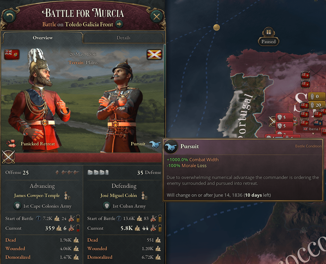 Trois nouvelles conditions de combat améliorent le rythme de la guerre. La poursuite est activée lorsqu'un camp est nettement plus nombreux que l'autre, ce qui permet d'augmenter les effectifs lors des attaques et donc d'infliger davantage de dégâts. La retraite panique se produit lorsqu'un camp perd une quantité substantielle d'effectifs avec un commandant inexpérimenté, ce qui conduit à des batailles plus rapides mais avec des pertes plus importantes. La retraite contrôlée, menée par un commandant expérimenté, se caractérise par une forte perte de moral, ce qui permet de conclure la bataille plus tôt avec un meilleur taux de récupération pour moins de pertes et de contre-attaques potentielles.