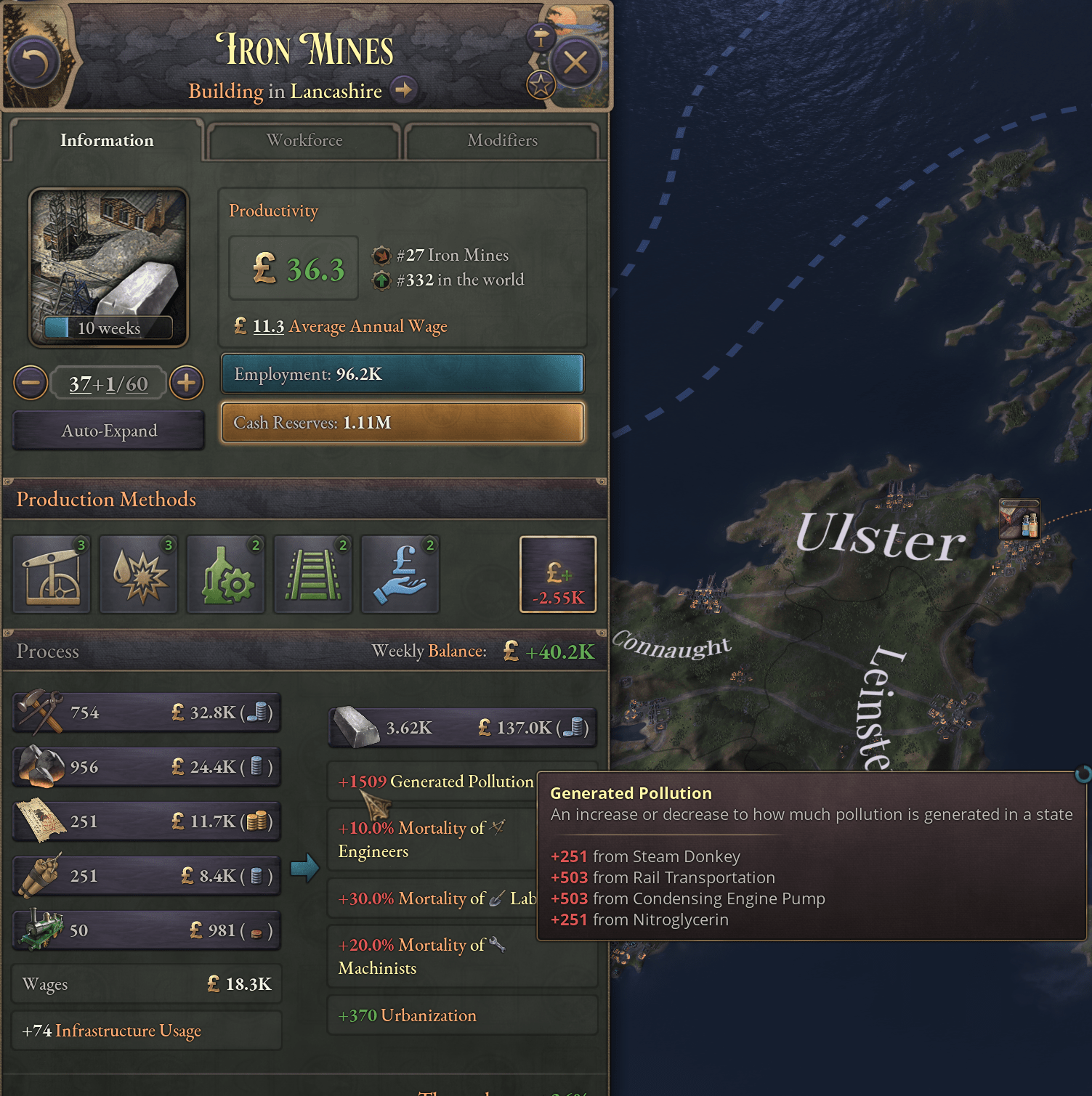 La pollution est générée par les méthodes de production des bâtiments, influencées par la technologie et la géographie, les technologies de pointe n'augmentant pas toujours la pollution. Les terres arables modèrent la pollution, affectant davantage les états-régions densément industrialisés que ceux où les campagnes sont étendues. La pollution a un impact sur les populations, augmentant la mortalité et diminuant le niveau de vie, tout en affectant également les états-régions, en influençant l'attraction migratoire. Les effets sur les populations sont modulés par les technologies et les établissements de santé, ce qui permet de gérer la pollution par le biais d'investissements dans les soins de santé. L'externalisation des industries polluantes vers des états-régions non incorporés déplace l'impact vers ces derniers. Cela entraîne un rééquilibrage des lois sur les soins de santé, l'assurance maladie privée et les hôpitaux de bienfaisance offrant moins de réduction de l'effet de la pollution que l'assurance maladie publique, chacun ayant un impact différent sur les individus en fonction de leur richesse. La pollution sert de mécanisme de contrôle de la croissance démographique en milieu et en fin de partie, offrant aux joueurs un levier de contrôle sociétal avec des compromis.
