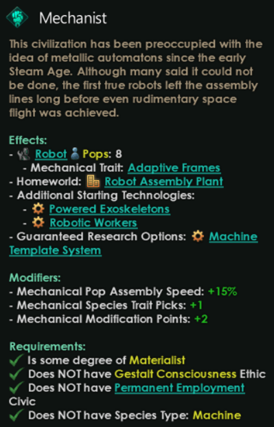 Avec toute l’attention que l’Âge de la Machine accorde aux empires mécaniques de toutes formes, il convient également d’améliorer l’origine mécaniste... Le mécaniste octroie désormais +2 points de trait de machine ainsi qu’un choix de trait supplémentaire, et remplit cela en commençant vos robots avec le trait Cadres adaptatifs, en tirant parti du nouveau système de modding automatique que nous introduisons dans la mise à jour 3.12 « Andromède ». Vous devrez attendre jusqu’au 4 avril pour obtenir tous les détails sur la façon dont cela fonctionne.