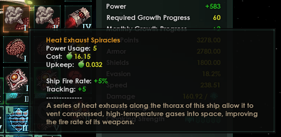 Comme chacun des différents stades de croissance de chacune des classes de vaisseaux biologiques peut être construit dans un chantier naval, nous avons profité de l’occasion pour implémenter des en-têtes pliables lors de la sélection des vaisseaux à construire.