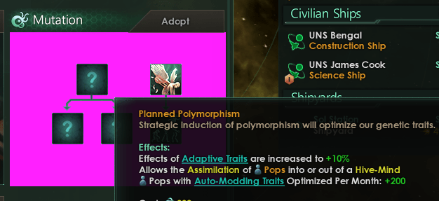 Au fur et à mesure que votre empire progresse dans la situation de biomorphose, les choix d’approche que vous faites (pureté, clonage ou mutation) n’influencent pas seulement les événements, ils déterminent également les traditions auxquelles vous aurez accès dans un nouvel arbre d’ascension génétique unique.