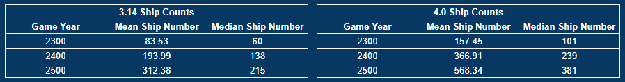 En enquêtant sur certaines sauvegardes de la 4.0 sur le forum de rapport de bugs, j’ai remarqué un nombre inhabituellement élevé de vaisseaux dans les sauvegardes de fin de partie (plus de 24000 vaisseaux !), et j’ai demandé à l’équipe d’analyse de déterrer quelques informations. J’ai posté ceci sur nos forums plus tôt cette semaine, qui compare le nombre moyen de vaisseaux dans tous les « empires par défaut » sur un mois chacun des jeux 3.14 et 4.0 :