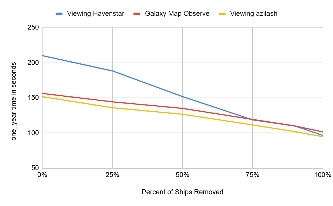 Dans ma prochaine enquête, j’ai pris un jeu Huge Grand Admiral 200 ans après le début du jeu et j’ai effectué une série de tests, explorant comment le nombre de vaisseaux dans la galaxie affectait la sauvegarde. Au cours de ces essais, j’ai également constaté qu’il y avait une différence substantielle en fonction de ce que la caméra regardait. Voir Havenstar, le système de capitale de l’un des plus grands empires, fonctionnait généralement moins bien que de regarder la carte de la galaxie entière en tant qu’observateur, et cela était en soi pire que de regarder le néant dans un azilash explosé.