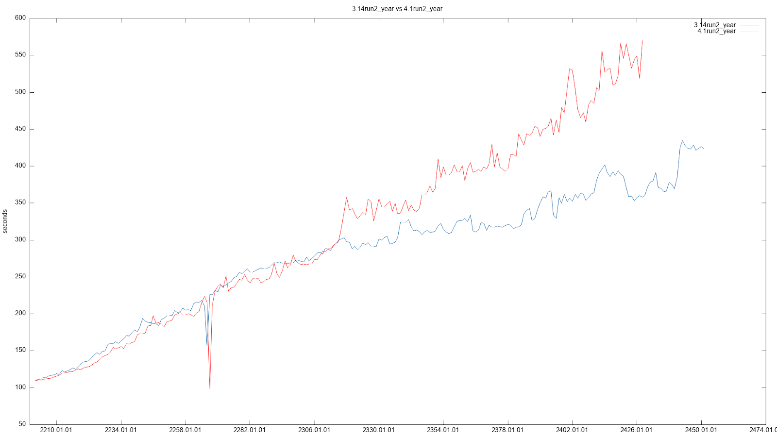 Nous constatons également que les performances de la version 4.1 sont légèrement meilleures que celles de la version 3.14 jusqu’à un peu après la version 2300, après quoi les deux divergent soudainement. Nous sommes actuellement en train de générer plus de sauvegardes et d’analyser les données pour mieux comprendre ce qui se passe exactement ici.