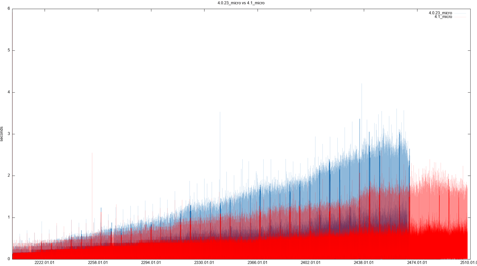 4.0.23 (bleu) vs 4.1 (rouge) micro ticks à différentes dates tout au long du jeu