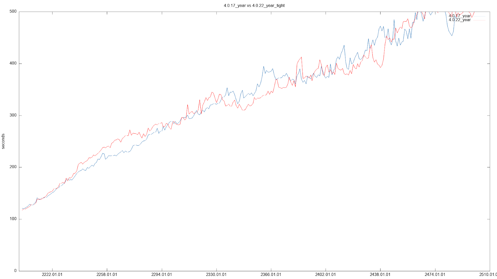 Par exemple, ici, vous pouvez voir que les deux versions, 4.0.17 et 4.0.22, fonctionnent de manière assez similaire, ce qui signifie que nous n’avons ni introduit de nouveaux problèmes ni amélioré.