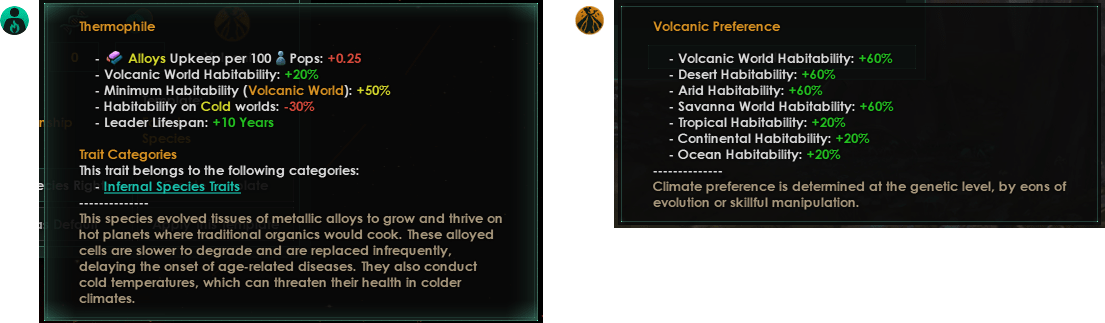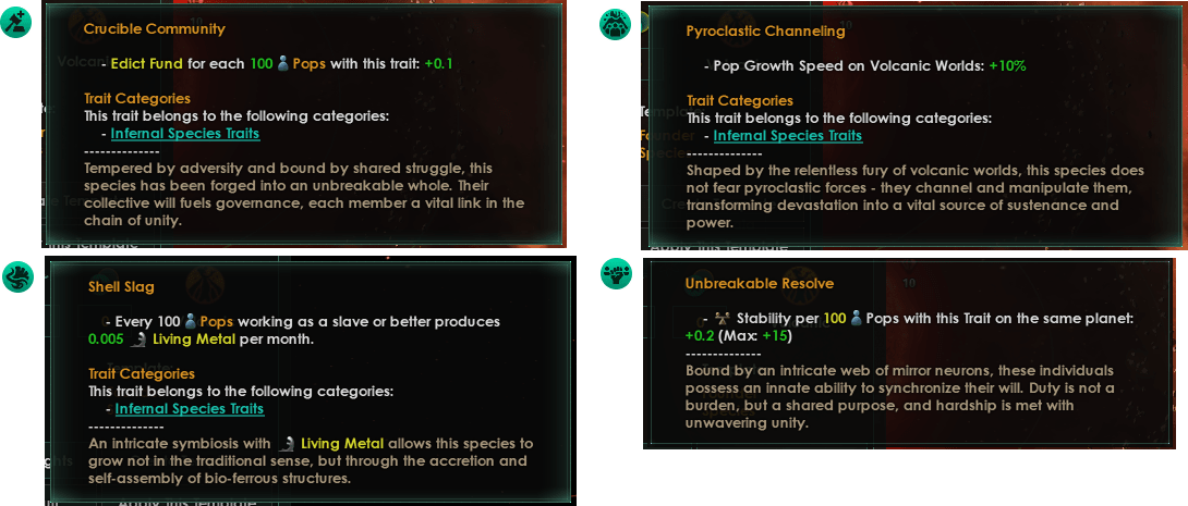 Pour le pack d’espèces Infernals, nous avons décidé de les faire exister quelque part entre les Lithoïdes et les Organiques normaux. Vos pops commenceront par le trait Thermophile, qui remplace leur consommation alimentaire par une petite quantité d’alliages. Ils prospèrent sur les mondes volcaniques mais souffrent sur les planètes plus froides. Dans des circonstances normales, cela modifie leur écran de préférence d’habitabilité, remplaçant les mondes arctique, alpin et de la toundra par volcanique.