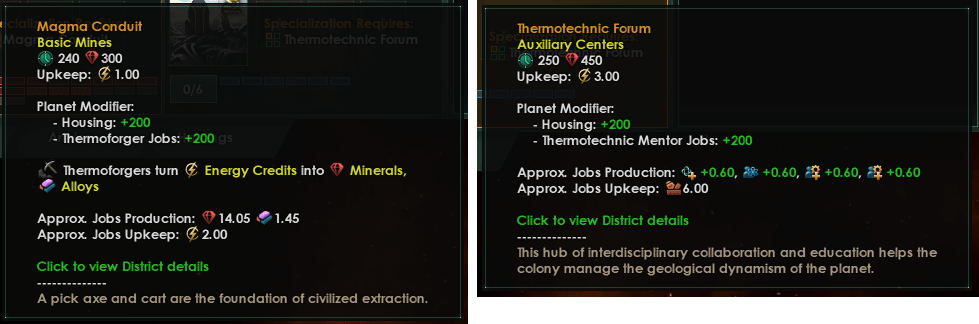 Les thermoforgeurs divisent leur production entre les minéraux et les alliages dont les Infernaux ont besoin de se nourrir, et les emplois de Spécialiste Mentor Thermotechnique fournis par les Forums modifient la production des Thermoforgeurs, des Techniciens, des Métallurgistes et des Artisans.