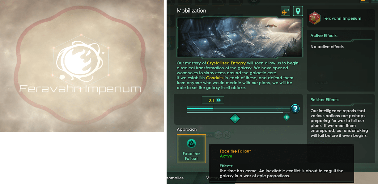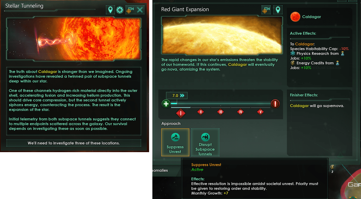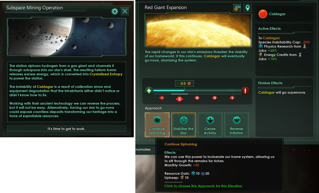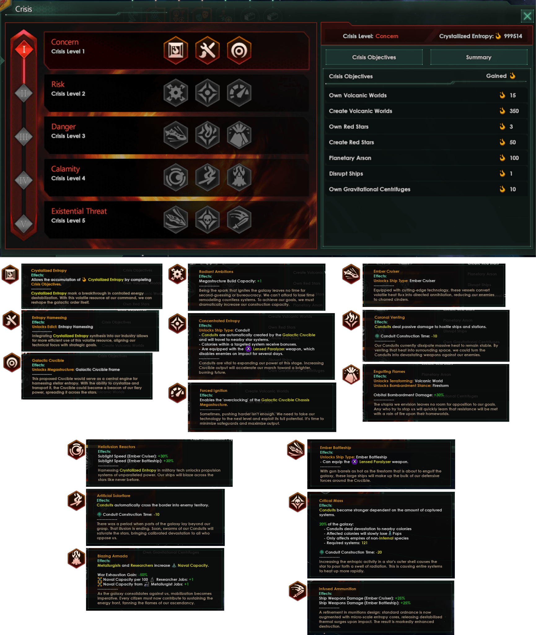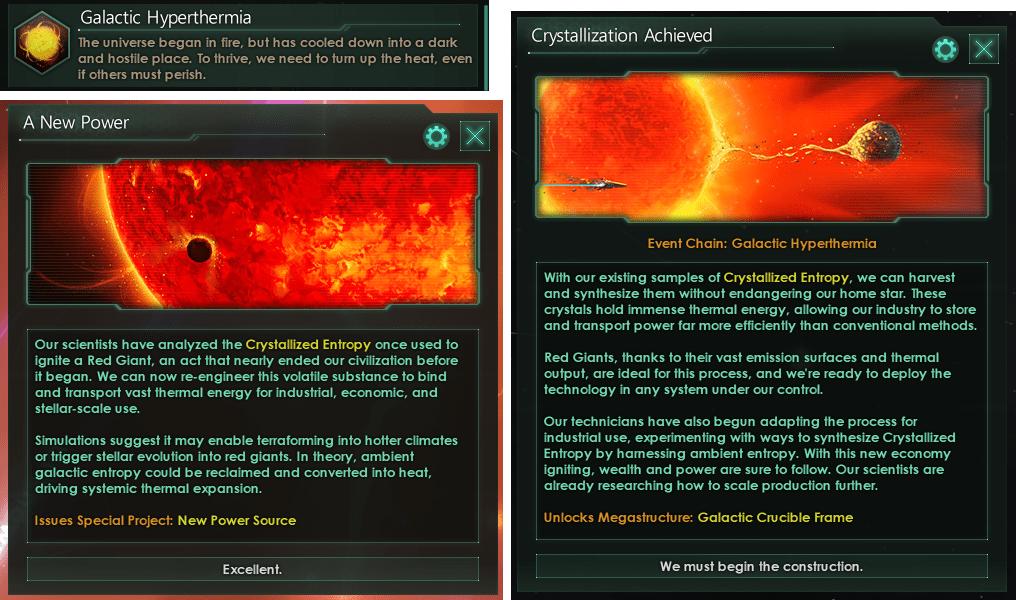 La mise à niveau de cette mégastructure lui permet de déployer des conduits d’entropie - des systèmes automatisés conçus pour canaliser et amplifier l’entropie stellaire. Tout comme ces pauvres imbéciles de plus tôt dans ce journal de développement l’ont fait par accident à votre étoile natale, vous pouvez intensifier considérablement les étoiles, les transformant en géants rouges pour soutenir l’expansion de votre empire.