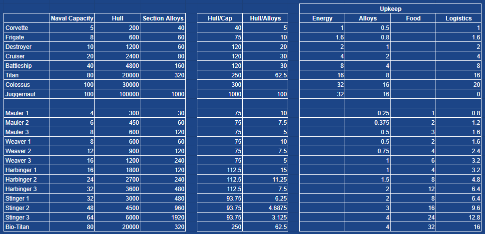 Voici un extrait de tableau Excel qui montre la capacité navale provisoire, la coque, le coût et l’entretien pour différents navires. Les coûts et (surtout) l’entretien sont nettement plus élevés qu’auparavant. Les frégates sont désormais plus rapides (se déplaçant à la vitesse de Destroyer au lieu de Croiseur), plus robustes, obtiennent un autre emplacement Aux, et utilisent des réacteurs de qualité Destroyer au lieu de ceux de Corvette. Les Rayons de Perdition Titan (et armes similaires) infligent des dégâts collatéraux à des flottes entières. (Cela pourrait être modifié dans les futures mises à jour de la bêta ouverte, par exemple atteindre 500 navires de capacité navale dans le système, si cela semble encourager trop la division de la flotte.)