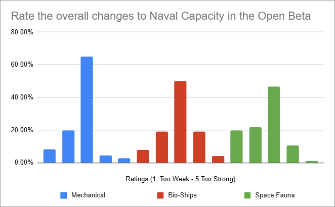 Même s’il y a un bon pic à 3 pour les vaisseaux mécaniques, il y a une forte tendance à être « trop faible » pour Fauna. La plupart des commentaires étaient en grande partie des changements, même si les pirates et les Empires Déchus étaient mentionnés à plusieurs reprises, ainsi que ce premier projet spécial Cutholoid. Nous avons déjà affaibli les pirates, et nous voulons que Fallen Empires soit bien plus difficile qu’il ne l’a été depuis quelques années, mais ils en font peut-être un peu trop. Le Cutholoïde n’était clairement pas amusant – donc nous avons réduit le seuil requis pour le contester dans la mise à jour d’aujourd’hui.