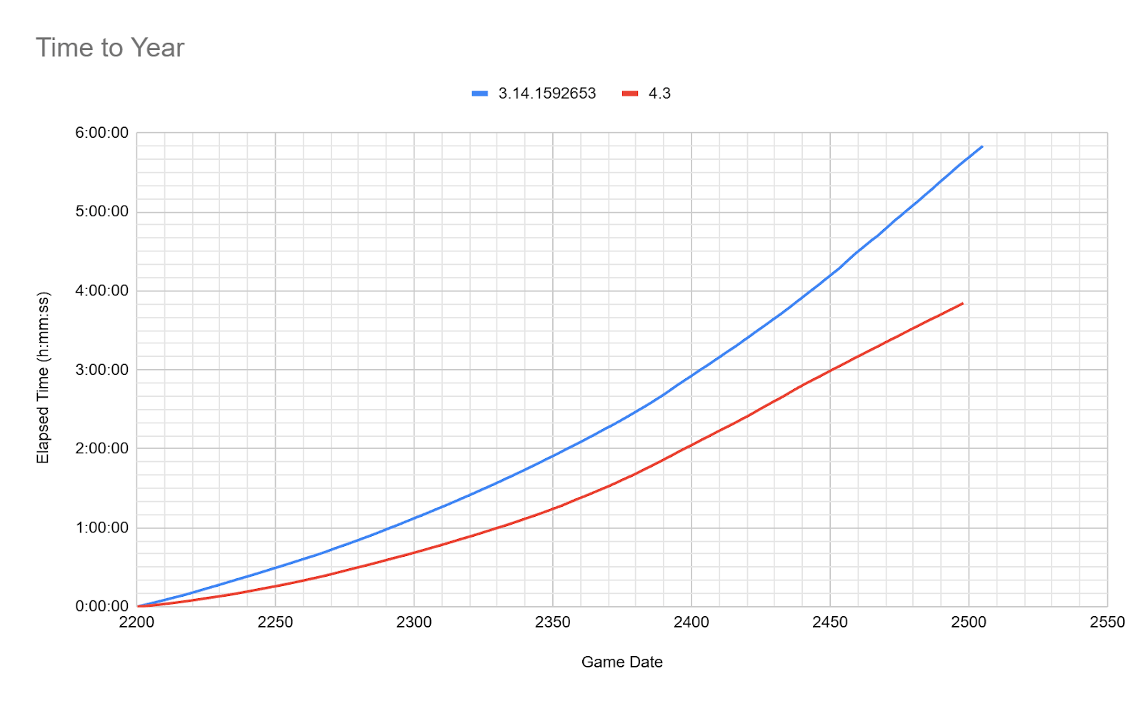 Le jeu 4.3 s’est terminé à 2500.01.01, nous avons terminé le jeu 3.14 à mi-2506 car à ce moment-là c’était déjà presque deux heures de plus que la vidéo 4.3. 4,3 était 31 % plus rapide que 3,14, bien qu’il continuait de diverger lorsque nous avons arrêté la course à 3,14.