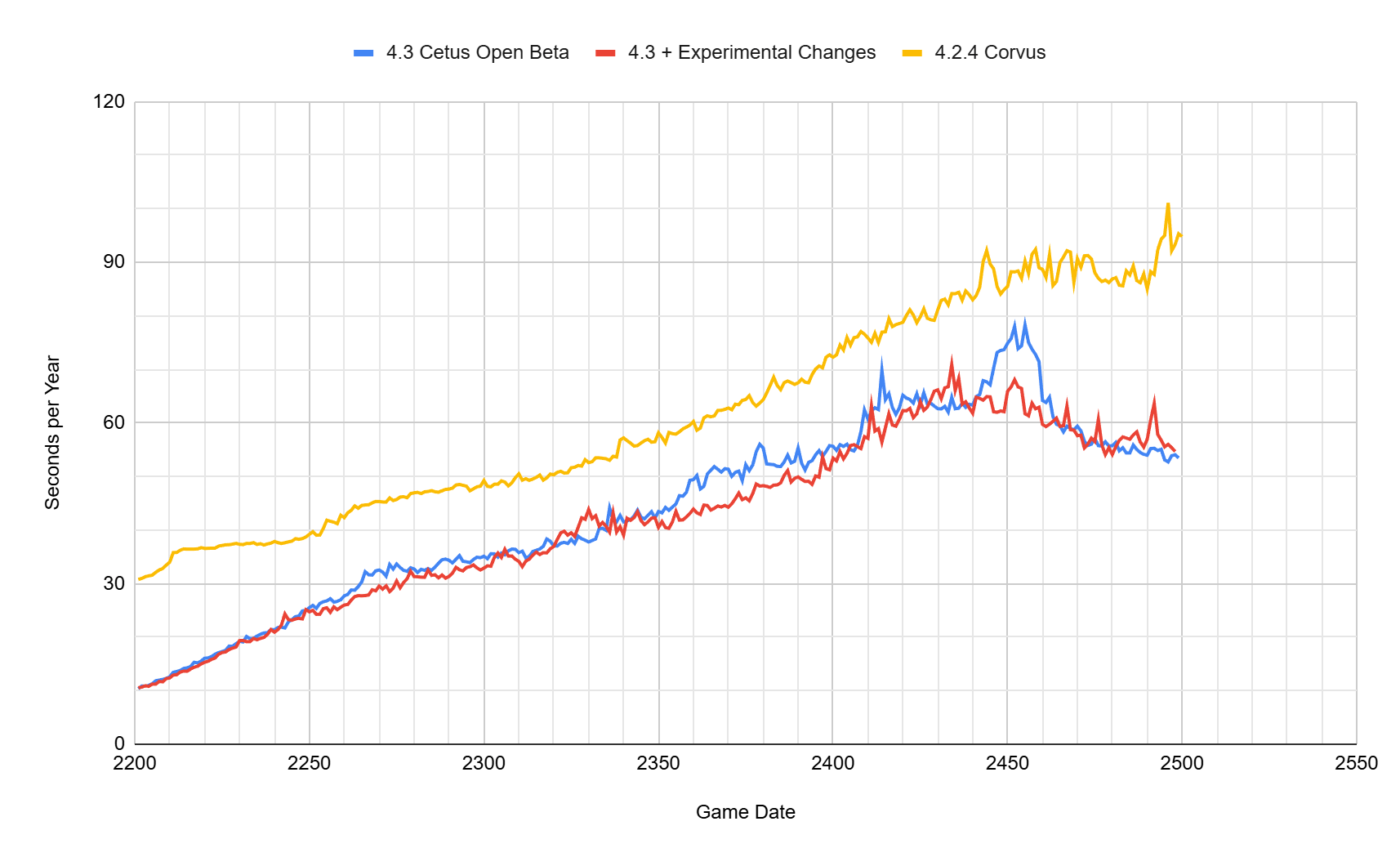 Voici un graphique représentant les secondes par an, généré à partir de .tsv en utilisant le paramètre de ligne de commande -gamestatetimer.