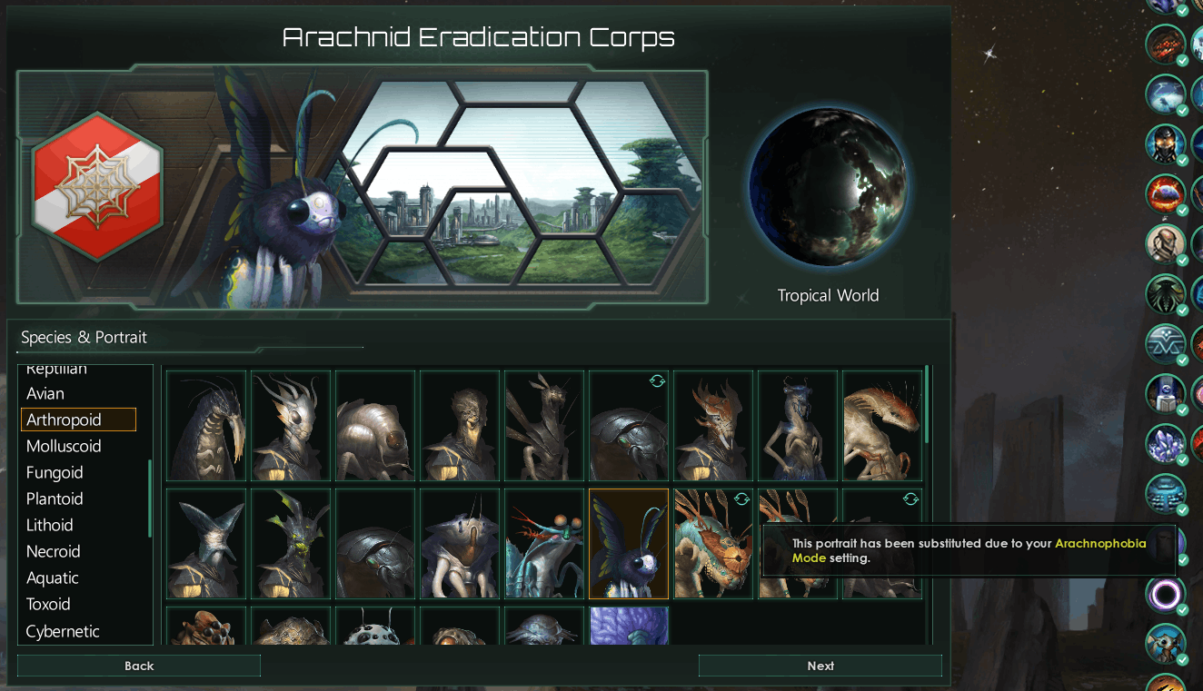 "Y aura-t-il enfin une option pour masquer les portraits ou les catégories d’espèces ? J’ai tout mis en place pour Stellaris sauf l’édition Galaxie, précisément parce que je ne veux pas d’autres araignées dans mon jeu !"