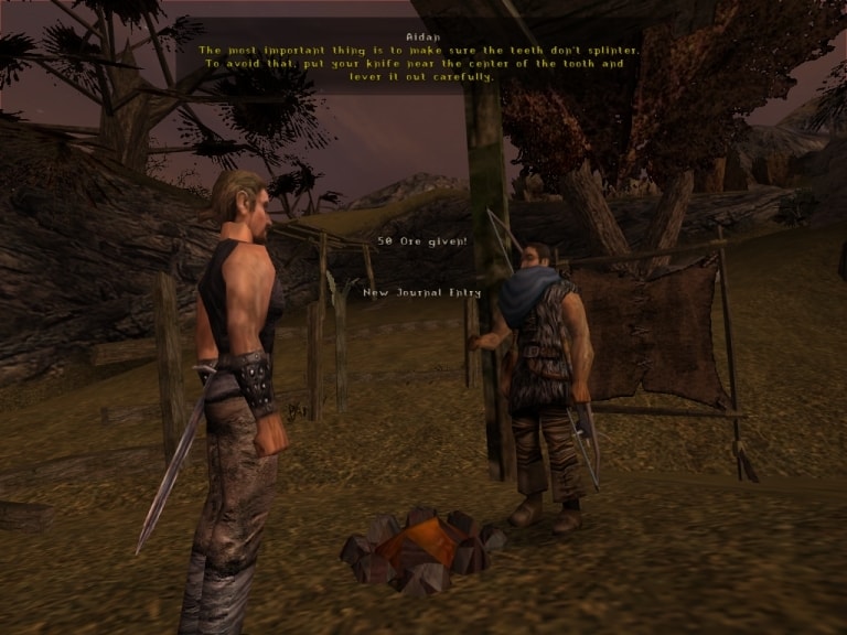 Quoi qu’il en soit, mon petit groupe et moi attaquons les petits pillards des environs, pour les dépouiller du fruit de leur rapine et nous faire un peu d’argent de poche. Faut dire que les paysans du coup que j’ai recruté sont loin d’être heureux avec eux. Je finis par trouver une cache, d’où je libère le frère du marchand du début, qui me propose dès lors de participer à une petite rixe nocturne. Malgré ma fougue, elle tourne assez mal, mais les événements se sont quand même déroulés correctement, et c’est blessé que mon petit groupe et moi nous retrouvons désormais seuls, sans repères et sans amis.